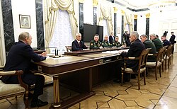 The Royal United Services Institute reported that Russia's plan involved defeating Ukraine within ten days and capturing or killing its government, followed by "mopping up" operations; establishing filtration camps for Ukrainians; setting up occupation regimes; executing people involved in the Revolution of Dignity; and annexation.[106][107][108] The decision to invade was reportedly made by Putin and a small group of war hawks or siloviki in Putin's inner circle, including national security adviser Nikolai Patrushev and defence minister Sergei Shoigu.[109]