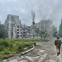 On 24 June, CNN reported that, amid scorched-earth tactics by advancing Russian troops, Ukraine's armed forces were ordered to evacuate Sievierodonetsk; several hundred civilians taking refuge in the Azot chemical plant were left behind, with some comparing their plight to those in Mariupol.[223] On 3 July, the Russian defence ministry claimed Lysychansk had been captured and occupied.[224] On 4 July, The Guardian reported that after the fall of the Luhansk oblast, Russian troops would continue their invasion into the adjacent Donetsk Oblast to attack the cities of Sloviansk and Bakhmut.[225]